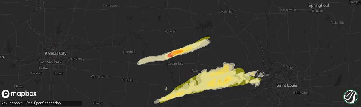 The weather event in Hallsville, MO on March 4, 2011 includes Hail map. 7 states and 123 cities were impacted and suffered possible damage. The total estimated number of properties impacted is 1,583.