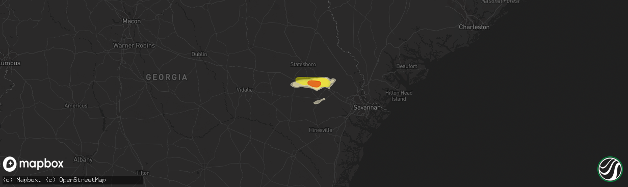Estimated number of impacted properties by a 2.50" hail or largerStorm reports in Pembroke, GA