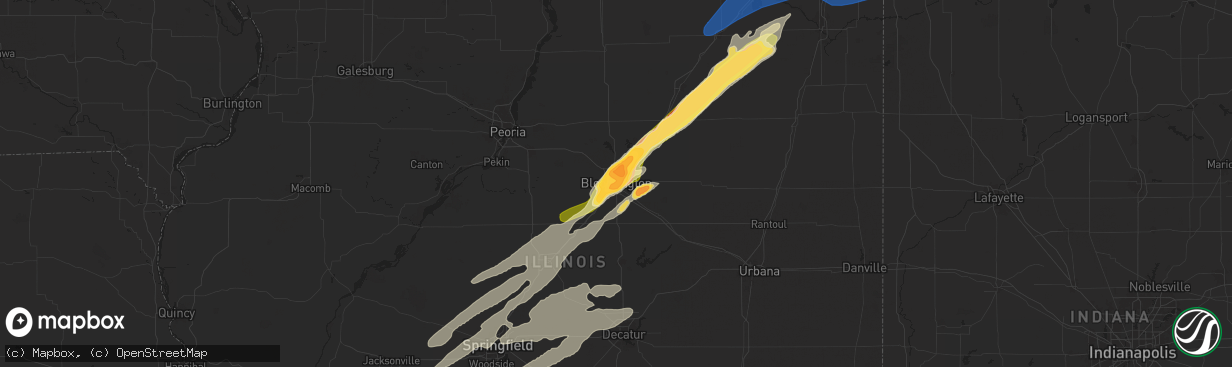 The weather event in Bloomington, IL on May 15, 2025 includes maps. 0 states and 0 cities were impacted and suffered possible damage. The total estimated number of properties impacted is 0.