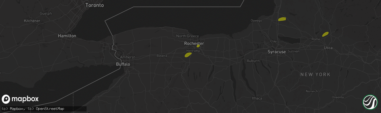 The weather event in Rush, NY on May 17, 2025 includes Hail, Wind, and Tornado maps. 15 states and 700 cities were impacted and suffered possible damage. The total estimated number of properties impacted is 182.