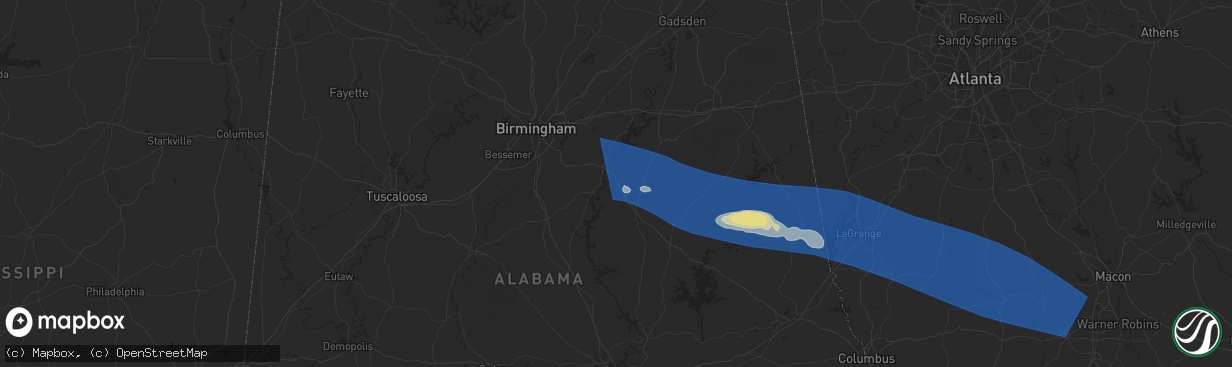 The weather event in Childersburg, AL on May 18, 2025 includes Wind, Hail, and Tornado maps. 14 states and 906 cities were impacted and suffered possible damage. The total estimated number of properties impacted is 0.