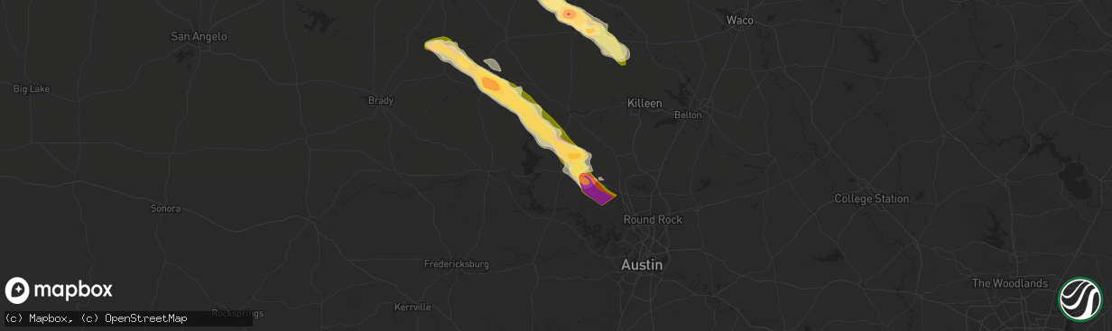 Estimated number of impacted properties by a 2.50" hail or largerStorm reports in Burnet, TX