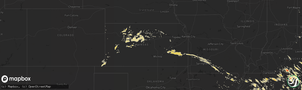 The weather event in Kansas on July 14, 2015 includes maps. 0 states and 0 cities were impacted and suffered possible damage. The total estimated number of properties impacted is 0.