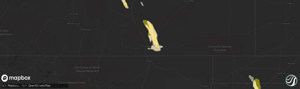 The weather event in Trinidad, CO on July 16, 2014 includes Hail map. 6 states and 96 cities were impacted and suffered possible damage. The total estimated number of properties impacted is 181.