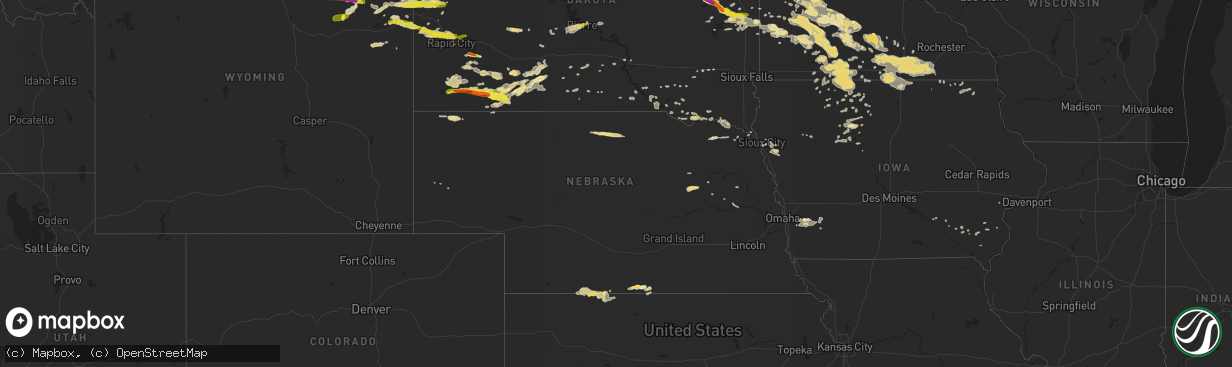 The weather event in Nebraska on July 16, 2016 includes Hail map. 25 states and 728 cities were impacted and suffered possible damage. The total estimated number of properties impacted is 0.