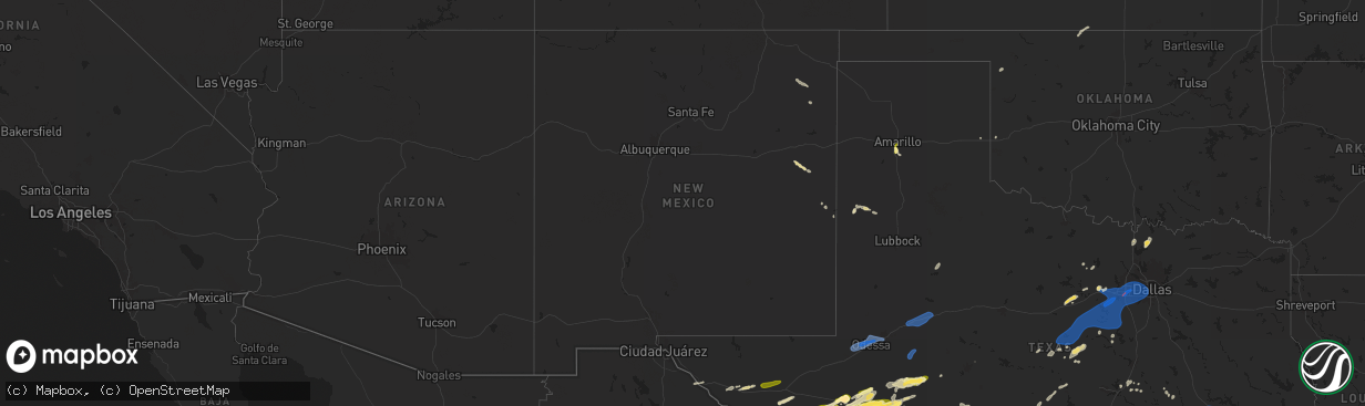 The weather event in New Mexico on October 24, 2025 includes Hail, Wind, and Tornado maps. 4 states and 184 cities were impacted and suffered possible damage. The total estimated number of properties impacted is 0.
