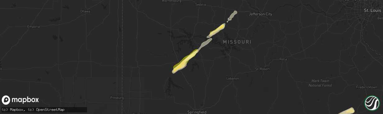 The weather event in Wheatland, MO on November 17, 2025 includes Hail map. 1 state and 18 cities were impacted and suffered possible damage. The total estimated number of properties impacted is 424.