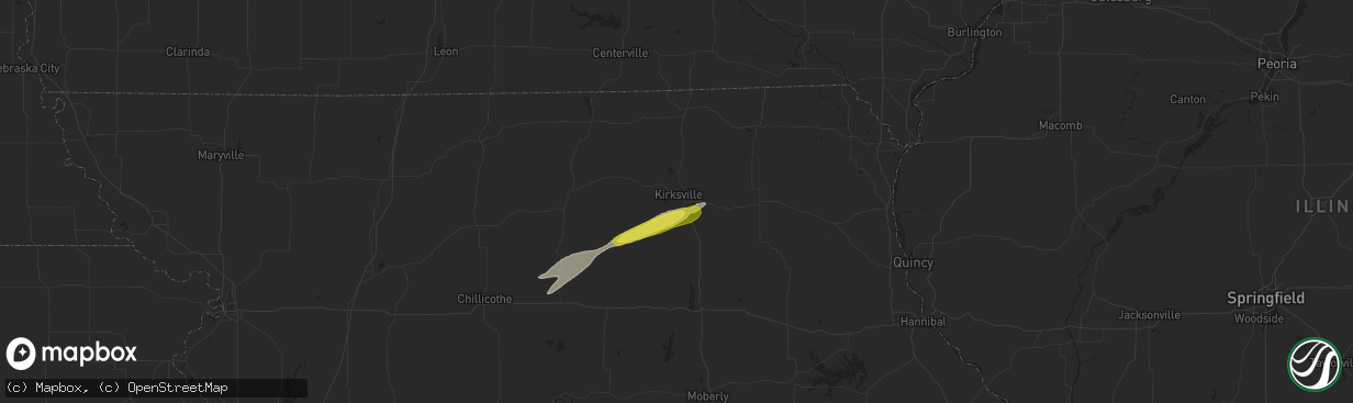The weather event in Kirksville, MO on December 4, 2017 includes Hail map. 4 states and 100 cities were impacted and suffered possible damage. The total estimated number of properties impacted is 743.